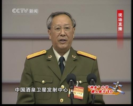 陈炳德:在这举世瞩目、激动人心的重要时刻,请允许我首先介绍一下前来视察指导的党和国家领导人,亲临北京航天飞行控制中心视察指导的有:中共中央总书记、国家主席、中央军委主席胡锦涛同志,中共中央政治局常委、国家副主席曾庆红同志,中共中央政治局常委、国家政协主席贾庆林同志,中共中央政治局常委、中央纪委书记吴官正同志。亲临酒泉卫星发射中心的有,中共中央政治局常委、国务院总理温家宝同志,中共中央政治局常委李长春同志,中央政法委书记罗干同志,中央政治局委员、中央军委副主席、国务委员曹刚川同志,还有全国人大、国务院、全国政协的领导。
